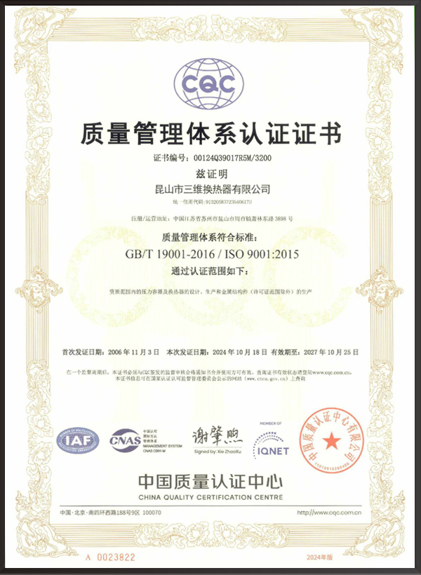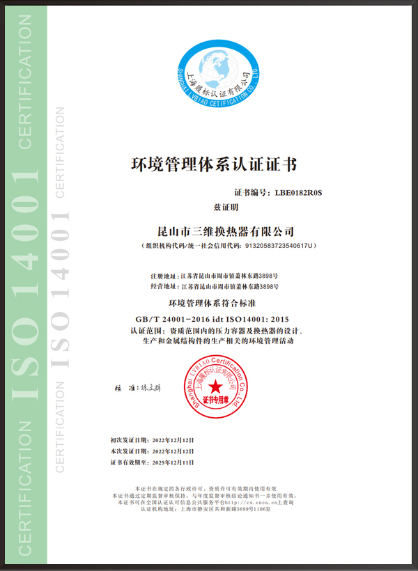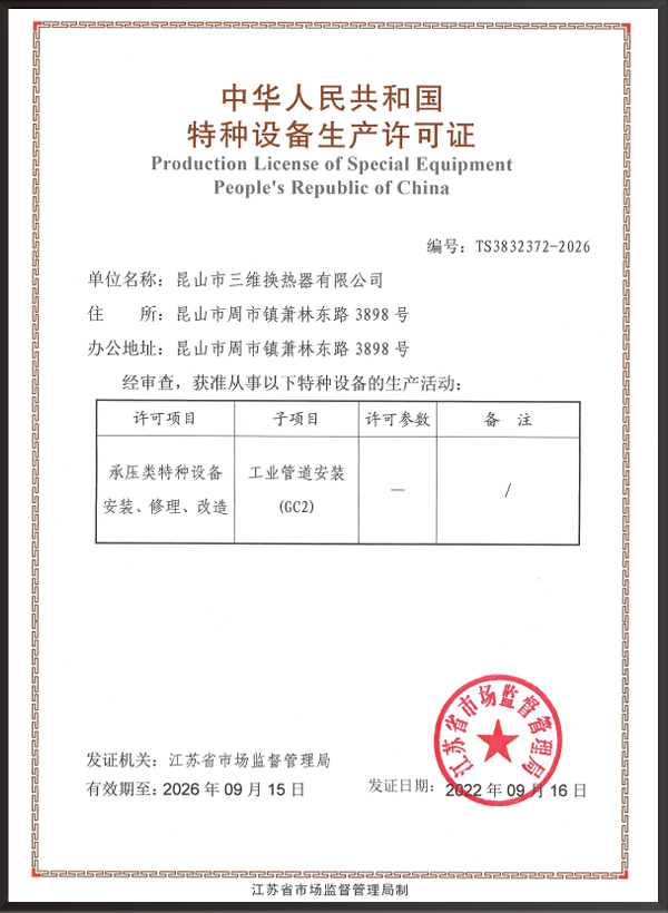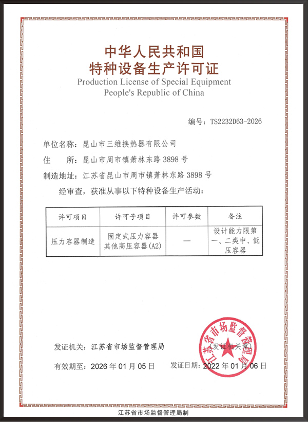 昆山市三維換熱器有限公司注冊資本5000萬元,資產(chǎn)2.1億元,公司地址位于江蘇省昆山市周市鎮(zhèn)蕭林東路3898號,法人代表為顧安生,公司設有技術部、生產(chǎn)部、檢驗部。